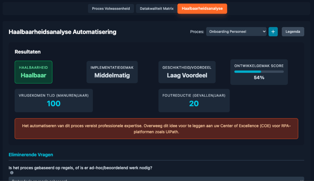 Processen die volledig of grotendeels regelgebaseerd zijn, scoren hoog op haalbaarheid; processen met veel uitzonderingen of subjectieve beslissingen scoren laag.